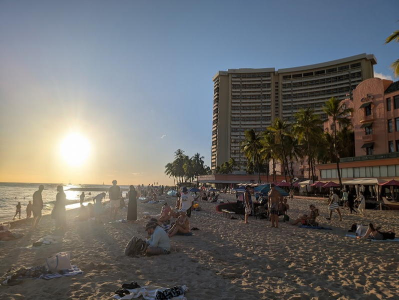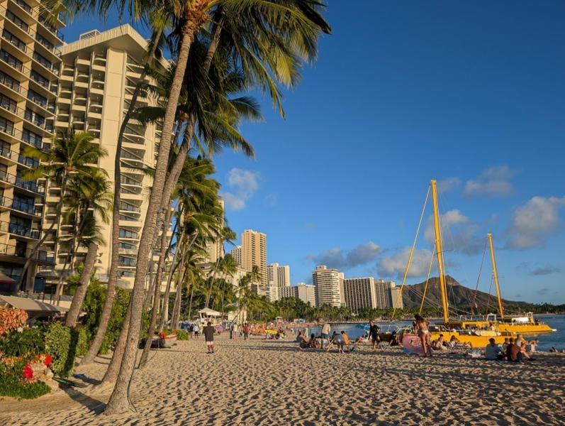 かつての日本人のハワイのイメージはまさにここだった、ダイヤモンド・ヘッドを背に赤みがかった砂が美しいがビーチは意外に幅が狭く象徴的な場所
