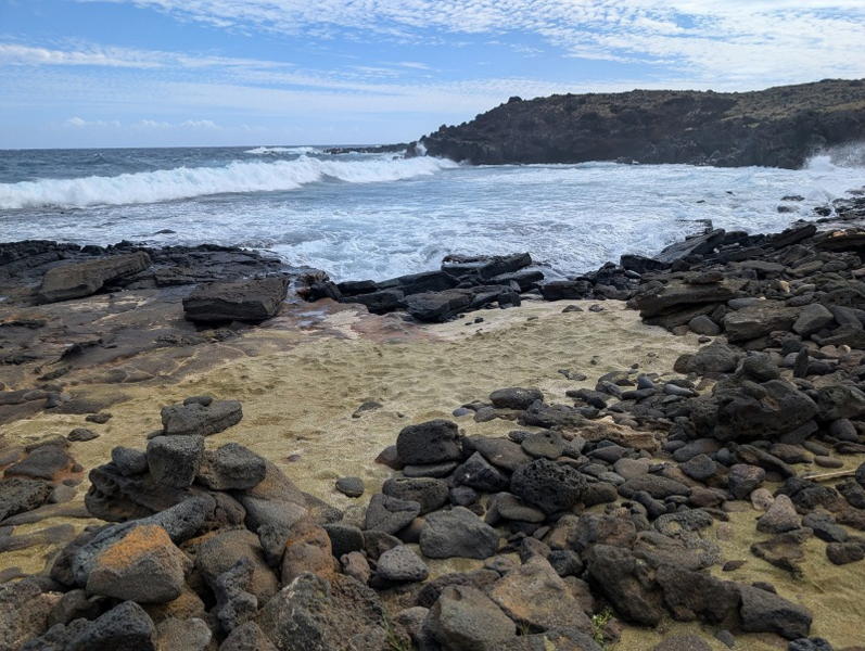 島の最南端近くにある緑の砂のビーチ(写真左:グリーン・サンド・ビーチ、右:グリーン・サンド・ビーチ手前の別のビーチの緑の砂)